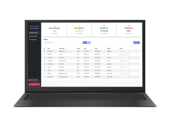Created an academic management system using HTML, CSS, Bootstrap, JavaScript, PHP (OOP with PDO), and MySQL. Features secure login, modular dashboards, student/course management, fee tracking, and reporting with a modern glassmorphism UI and consistent branding.