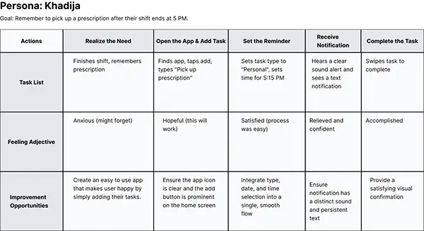 I created a user journey map of Khadija’s experience using the app to help identify possible pain points and improvement opportunities.